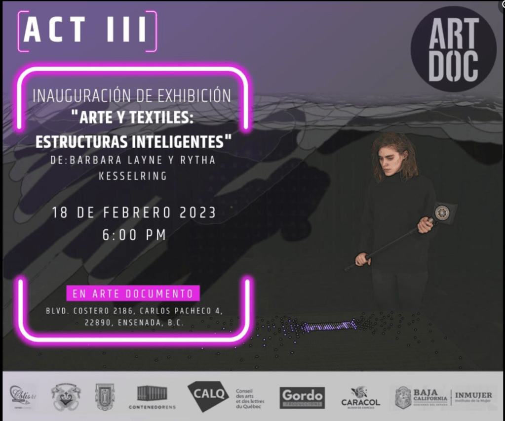 Rythâ Kesselring and Barbara Layne will be featured in Arte, Ciencia y Tecnologiá VOL III at the Arte Documento Gallery in Ensenada, Baja California, Mexico. They will be presenting an exhibition, an artists’ presentation and a workshop in electronic textiles in partnership with the Gallery, The Museo del Caracol and the Universidad Autónoma de Baja California. February 16-24, 2023.